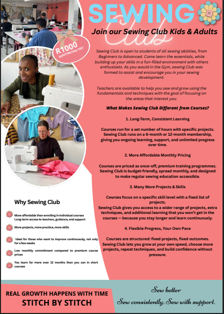 Learn to sew an Apron and a Placemat in just two classes for only R499. We are open throughout the year and will be closing on the 21st of December and opening on the 6th of January.